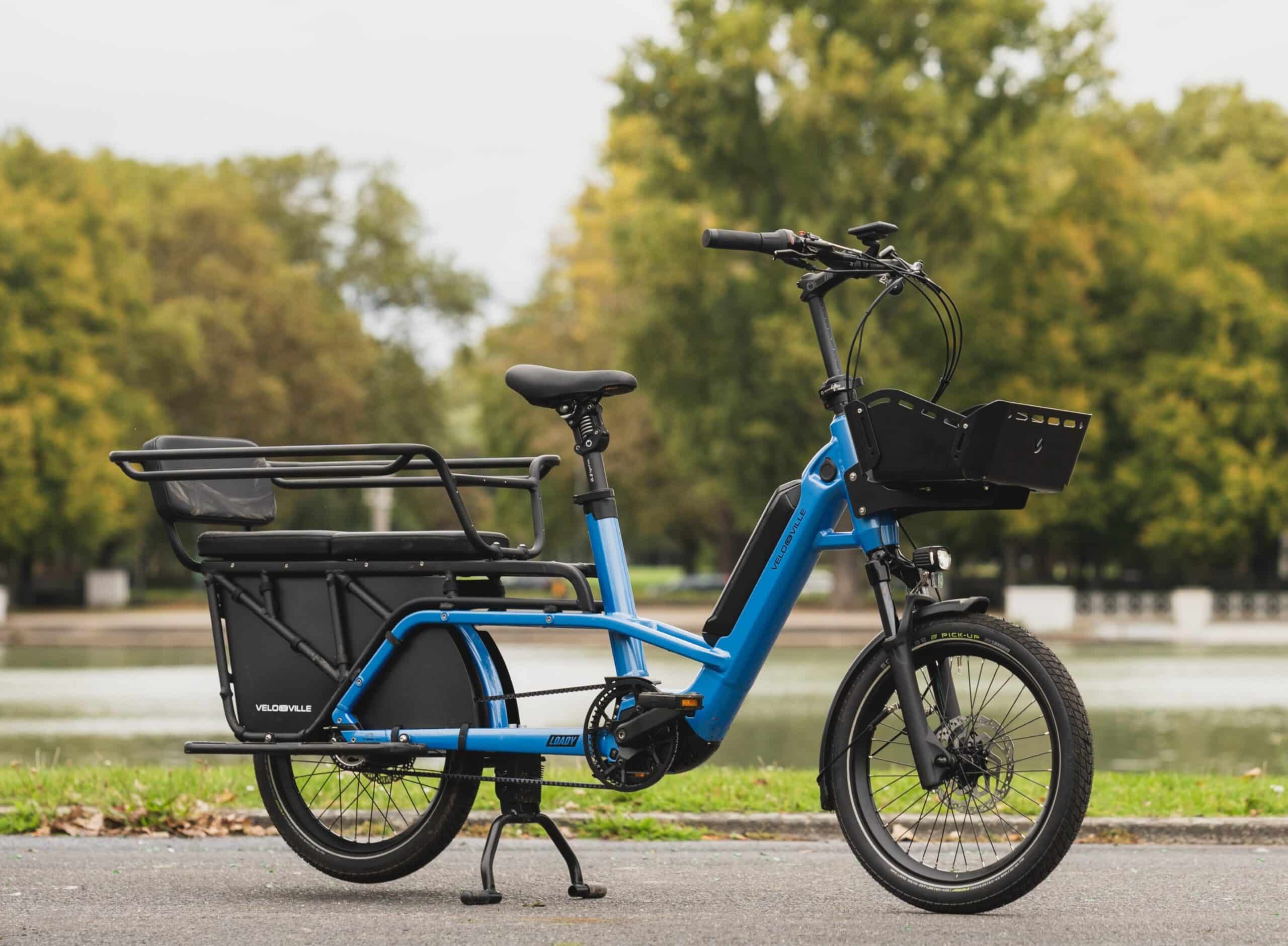 Le nouveau Longtail de la marque allemande Velo-de-Ville. Motorisation Bosch Performance CX. Longueur total du vélo 200cm. Le porte bagage arrière peut porter jusqu’à 75 kg (180 kg au total sur le vélo)